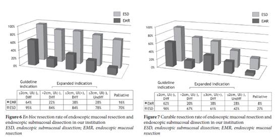 EMR had been adopted as a treatment option for small intramucosal carcinoma but ESD enabled high en bloc resection rates for small and large lesions, as well as those with scarring. Consequently, endoscopic resection has been established as a standard treatment for management of EGC in Japan.