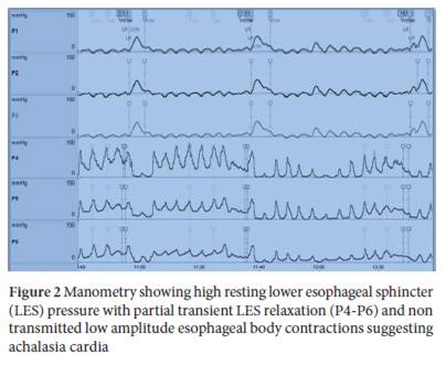 Although immediate success rates of endoscopic botulinum injection are good, the effect wanes off over time with less than 50% patients being symptom free one year after injection [1,8,9]. However, studies have shown that repeated injections of botulinum toxin may provide clinical relief in 60-85% patients at 2 years [9]. Age less than 50 years, vigorous achalasia, an initial clinical response to injection and decrease in LES pressure in response to injection have been shown to be factors that predict good response to botulinum toxin injection [9]. Our patient, who has shown a good response to botulinum toxin injection, is also planned for a repeat injection in case he has recurrence of symptoms.