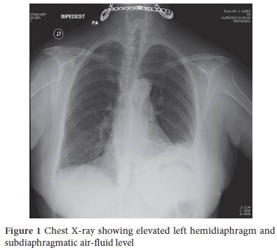 A 55-year-old patient presented to the emergency department with a 48-h history of pain in the lower left hemithorax with pleuritic characteristics. Two days before she experienced vomiting and diarrhea. At arrival, she complained of moderate pain in the left lower hemithorax. The pain was characterized as dull, constant, radiating to the left upper abdominal quadrant, aggravated by body posture changes without any alleviating factors, and accompanied by nausea and low-grade fever. Her medical history was unremarkable except for previous appendectomy. The patient did not take any medications, and she was not a smoker or an alcohol consumer. She looked ill with a blood pressure of 123/88 mmHg, a pulse rate of 84 beats/min and a temperature of 38.5°C. A thorough physical examination revealed hypoventilation in the left lower base without other relevant findings. The laboratory examination was unremarkable except for polymorphonuclear leukocytosis (total leukocyte count, 18000/mL; neutrophils, 86%) and an elevated C-reactive protein (86 mg/dL; reference range, 0-5). An upright chest radiograph demonstrated elevation of the left hemidiaphragm and free gas under the diaphragm (Fig. 1).
