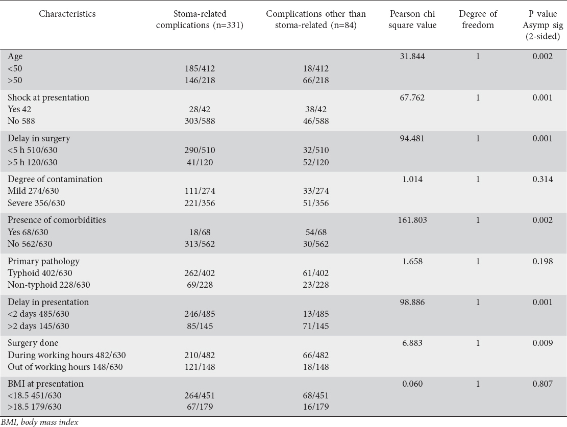 Typhoid perforation (n=402) was the most common pathology, followed by tuberculosis (n=106); trauma (n=81); and intestinal obstruction with gangrenous bowel (n=41) (Table 2). 299 patients had no stoma related complications. Skin excoriation was the most common stoma-related complication (Table 3). 42 patients developed retraction of stoma, of which 10 needed revision under general anesthesia. In the majority of cases (n=568) the perforation site was brought out as stoma (Table 4). Stoma-related complications were more numerous with typhoid perforations (262/402) as compared to those with non-typhoid perforations (69/228). Fecopurulent fluid was present in all the cases of typhoid perforations. Age more than 50 (P=0.002), delay in presentation (0.001), delay in surgery (0.001), presence of comorbidities (0.002) and shock at presentation (0.001), surgery done out of working hours (0.009) are the factors associated with increased rate of stomal and other systemic complications (Table 5).