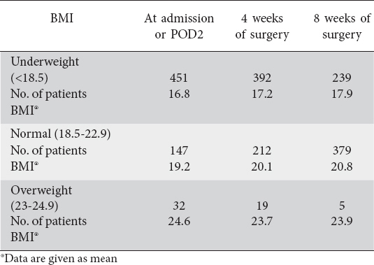 Body mass index (BMI) at admission, on post-operative day 2 (POD2), 4 and 8 weeks after surgery
