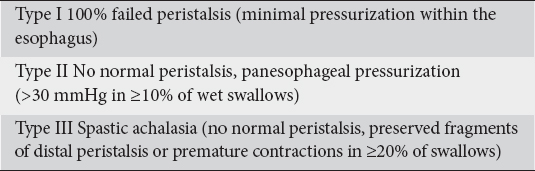 Furthermore, it was shown that emptying occurred intermittently during periods of pan-esophageal pressurization in patients with type II achalasia whereas patients with achalasia of types I and III had no emptying or relatively normal emptying during most swallows, respectively [32].