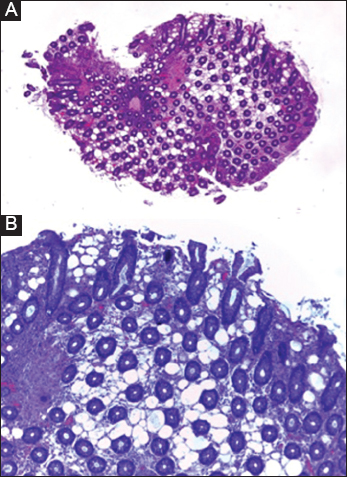 Pseudolipomatosis (H&E) (A) At low power field (40x), numerous cystic spaces were seen in the lamina propria of a polypoid fragment of colon mucosa. (B) A higher power field (100x) revealed adipocyte-like spaces, without inflammatory infiltrate or epithelial dysplasia