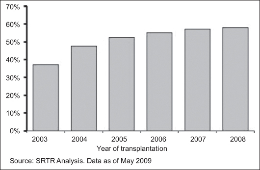 Figure 2 The proportion of hepatocellular carcinoma liver recipients that received any pre-transplant locoregional therapy by year of transplant from 2003-2008