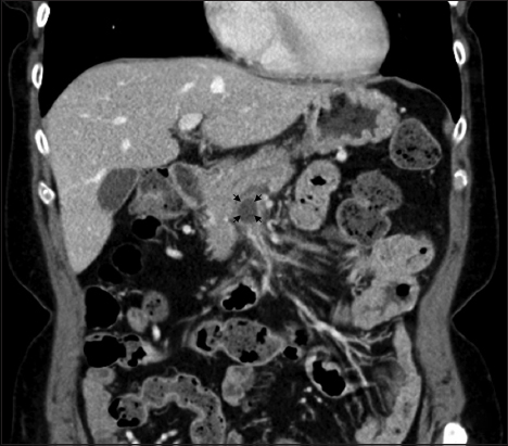 A careful evaluation of the CECT showed that the lesion was in fact extra-pancreatic; a hypodense thrombus within an aneurysmal dilatation of the superior mesenteric vein (SMV) measuring 35 mm and mimicking a “pancreatic cyst”. She was negative for protein C deficiency, protein S deficiency, antithrombin III deficiency, factor V Leiden mutation, prothrombin G20210A, hyperhomocysteinemia and antiphospholipid antibodies. Antinuclear antibody and anti cytoplasmic nuclear antibody were negative. Treatment with warfarin for 3 months after a prior low molecular weight heparin bridging showed gradual resolution of thrombus with decrease in the size of the aneurysm (Fig. 2, coronal view). Thus a surgery was averted.