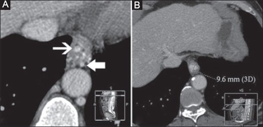Figure 1 True positive computed tomography scans for esophageal varices. (A) Small submucosal (thin arrow) and subserosal (thick arrow) esophageal varices. (B) Big submucosal esophageal varices