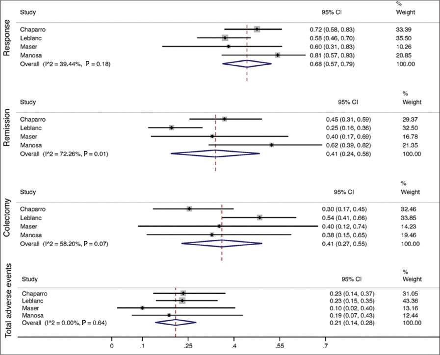 Articles were reviewed independently by two authors (JDF, MA) for publication date, type of salvage therapy (infliximab, cyclosporine) number of patients, response, remission, failure/colectomy, and any complications. Clinical remission was defined as normalization of bowel movement to <4/day without bleeding and off corticosteroids. Serious adverse events were infection or death.