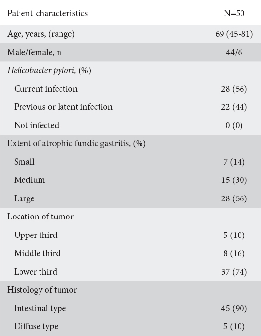 From February to December 2010, 190 patients with non-cardiac gastric cancer underwent gastric examination before ESD. Of these, 103 patients were examined by other endoscopists who did not participate in this study and 37 did not meet the inclusion criteria (16 had anticoagulant or NSAIDs, 8 had a history of H. pylori eradication, 8 had gastric resection and 5 had severe organ failure); thus, 140 patients were excluded from enrollment. A total of 50 patients participated in this study. The patients’ characteristics are shown in Table 1 [3].