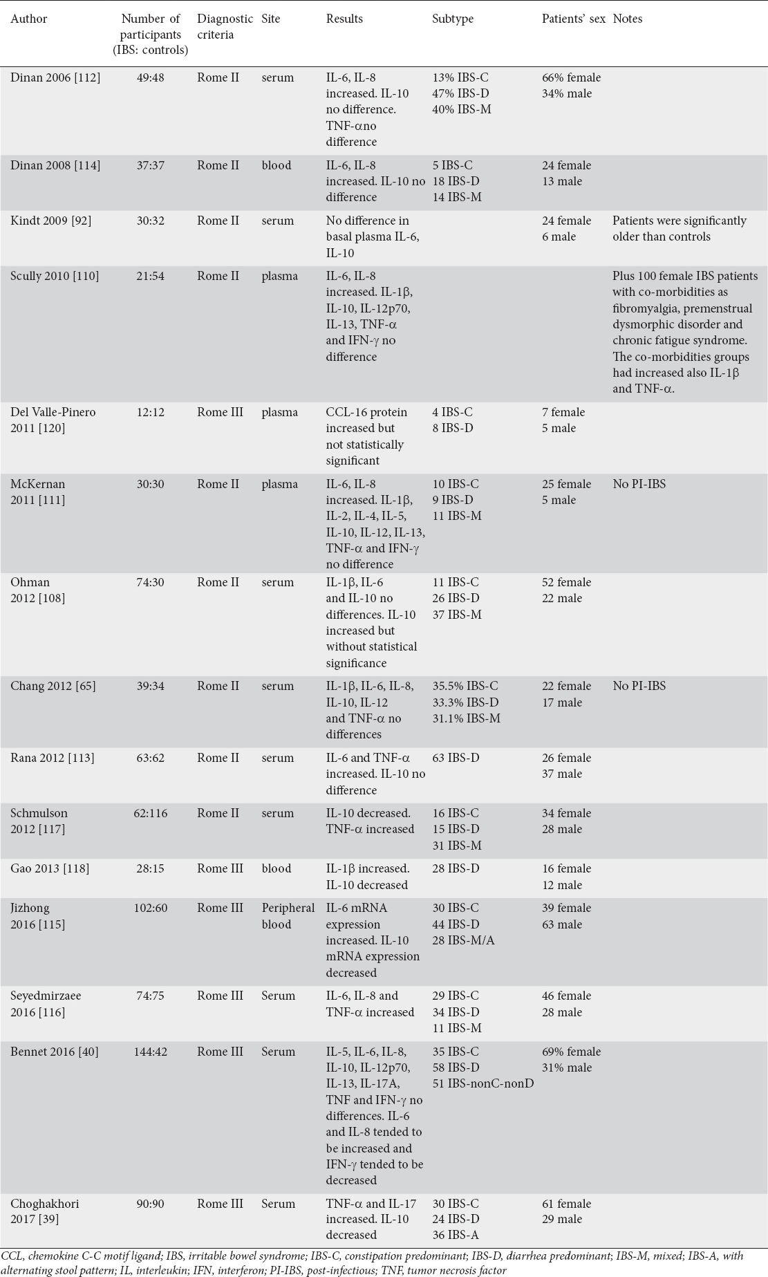 The majority of studies report cytokine levels in the systemic circulation but it is evident that there is great discrepancy among the results, possibly attributable to differences in cytokine measurement assays or the timing of specimen collection (Table 3). Nevertheless, most studies found IL-6 and IL-8 to be elevated in IBS patients [65,92,108,110-116], whereas IL-10 levels were lower or showed no difference compared with healthy controls [39,65,92,108,110-115,117,118]. Secretion of TNF-α is frequently reported without differences between patients and controls [65,110-112], but four studies with a large number of participants all reported that IBS patients had higher levels of TNF-α in serum [39,113,116,117]. Other cytokines, such as IL-1β, IL-2, IL-4, IL-5, IL-12, IL-13 and IFN-γ, were not measured in many studies, and when they were no differences were reported [65,108,110,111,118]. Two studies were published in 2016, each with more than 100 IBS patients. In the first, which was conducted in China and included 102 Rome III patients, the investigators reported higher IL-6 mRNA and lower IL-10 mRNA expression compared with controls. Furthermore, IBS patients with depression had a higher IL-6 level than those without depression [115]. However, in the latter group, which included 144 Rome III patients, no differences were detected in IL-5, IL-6, IL-8, IL-10, IL-12p70, IL-13, IL-17A, TNF or IFN-γ serum levels; IL-6 and IL-8 were higher and IFN-γ lower, but the difference did not reach statistical significance [40]. In addition, a recent study of 90 Rome III IBS patients and 90 healthy controls revealed that IBS patients had higher serum levels of TNF-α and IL-17 and lower IL-10 levels. Moreover, these inflammatory cytokines had a significant positive correlation with the severity of digestive symptoms and were negatively correlated with quality-of-life scores [39]. Interestingly, 100 IBS Rome II patients, with comorbidities that included fibromyalgia, premenstrual dysmorphic disorder and chronic fatigue syndrome, had higher levels of both IL-1β and TNF-α compared with the control group [110]. In a recent meta-analysis, sex-related analysis of cytokine imbalance in IBS demonstrated significantly lower levels of IL-10 in systemic circulation in male patients and significantly higher levels of TNF-α in female patients [119].