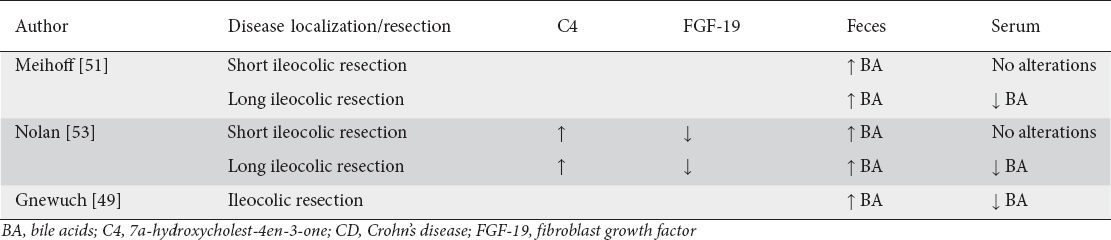 As regards variations in the BA amount in feces associated with the disease, Meihoff’s group described high fecal excretion of BAs, a rapid intestinal transit (responsible for diarrhea) and an overall reduction in the BA pool in patients with active ileal CD without previous bowel resection and in patients with ileal resection [51] (Table 3).