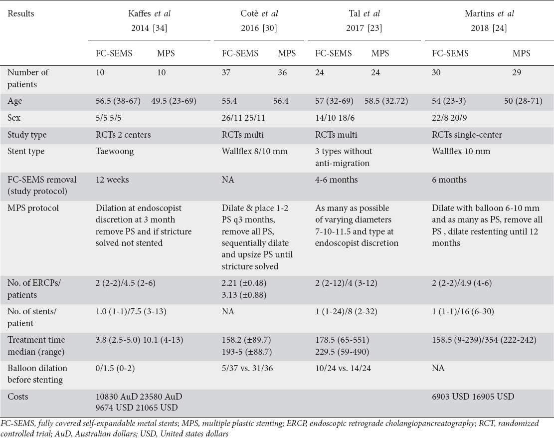 Types of studies: RCTs comparing the efficacy and safety of fully covered SEMS vs. MPS.