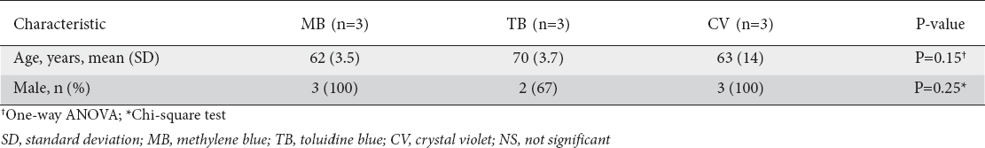 No significant difference in the baseline data of patients with SNADETs (age, sex, location, diameter, macroscopic type, and histology) was found between the 1% MB and 0.5% TB staining groups. Table 4 indicates that 1% MB achieved a significantly higher score compared with 0.5% TB (P=0.035) in all evaluation categories (general quality/structure/nuclei).