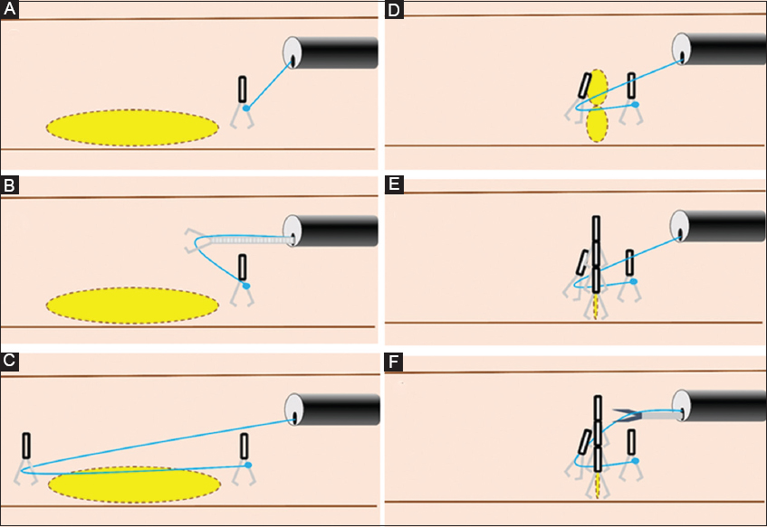Figure 4 Line-assisted complete closure method. (A) A clip with a nylon fishing line is applied through the working channel of a videoendoscope to the mucosa on the proximal side of the defect. (B, C) A second clip without line is applied to the mucosa on the distal side of the defect, anchoring the line of the first clip. (D) The clips are then gathered by pulling on the line. (E) Additional clips are applied to make the closure secure and tight. (F) After complete closure, the line is cut with scissor forceps