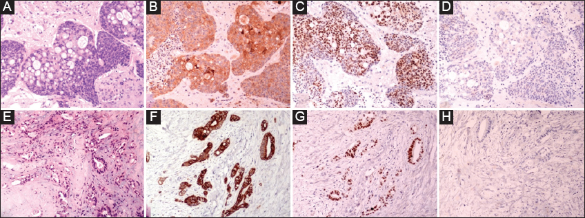 Figure 3 (A-D) Tissue sections from brain metastasis stained for (A) H&E, (B) CK20, (C) CDX-2 and (D) CK7. E-H: Representative sections (H&E, E) from surgical specimen of mastectomy showed histopathologic characteristics of a moderately differentiated adenocarcinoma with the following immunophenotype: (F) CK20+, (G) CDX-2+ and (H) CK7. The immunophenotype of both cases was consistent with metastatic colorectal carcinoma (magnification ×200)