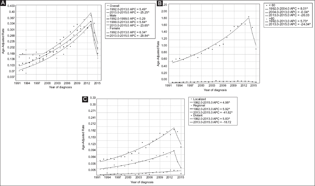 The SEER*stat software (version 8.3.5) was used to calculate all incidences and incidence-based mortality rates. The National Cancer Institute’s Joinpoint Regression Program, version 4.5.0.1 was used to calculate APCs [16]. The Joinpoint Regression software used t-tests to determine if APCs were statistically significant from zero; the difference was considered statistically significant for values of P<0.05. The software analyzed rates over time and detected significant changes in APCs, then selected the best model with the minimum number of joinpoints [17]. All statistical tests were 2-sided.