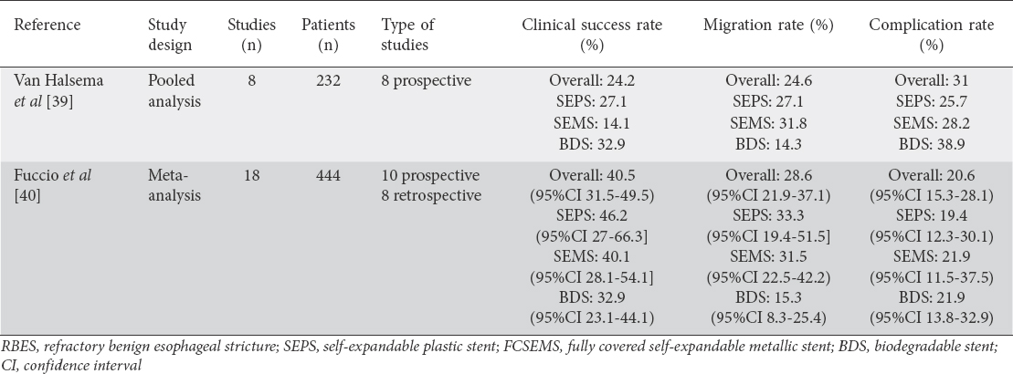 Table 3 Pooled analysis and meta-analysis evaluating different stent types for RBES