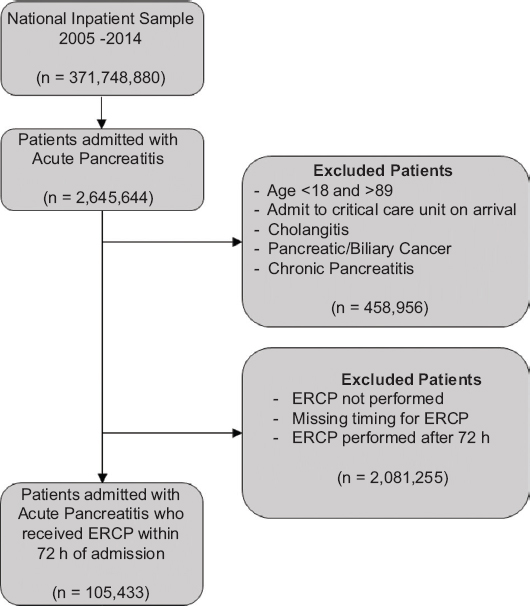 We chose the evaluation period from 1 January 2005 to 31 December 2014, based on the availability of complete data and an adequate sample size for modeling time trends. We eliminated discharge records with missing information for the year, mortality or primary diagnosis, according to a scheme suggested by the AHRQ [17]. The inclusion criteria included acute biliary pancreatitis defined by the primary diagnosis of acute pancreatitis in patients who underwent ERCP within the first 72 h of admission. These patients were probably thought to have a persistent biliary obstruction, thus prompting ERCP within 72 h based on current guidelines. Patients with a secondary diagnosis of cholangitis were excluded, as ERCP timing is well established in this patient population. Additionally, admission to the critical care units probably represented greater severity of the disease, related to a multitude of comorbidities, while the diagnostic and therapeutic avenues pursued are also convoluted in patients with pancreatic/biliary malignancies and chronic pancreatitis. Therefore, these patient populations were omitted to avoid confounding the outcome variables, such as length of stay, cost, or procedural considerations. Patients transferred from an external healthcare facility were also excluded, as the disease course in this patient population is uncertain. Finally, patients aged <18 and >89 years were excluded. A flowchart explaining the inclusion and exclusion criteria is shown in Fig. 1.