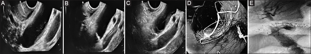 Figure 1 (A) Endoscopic ultrasound image showing dilated choledochal biliary duct (CBD); (B) puncture of the CBD; (C) deployment of distal flange of a lumen-apposing metal stent in the CBD lumen; (D) endoscopic check after stent placement; (E) final cholangiography with regular biliary outflow