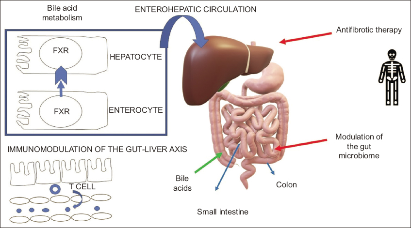 Figure 1 The new agents target the multiple pathways of the pathophysiology of primary sclerosing cholangitis. Upper right: agents for the production and the circulation of bile acids. Lower right: immunomodulators that stop T-cells from the gut causing inflammation in the liver. Upper left: antifibrotic therapy stops the hepatic fibrosis. Lower left: agents that regulate the gut microbiome