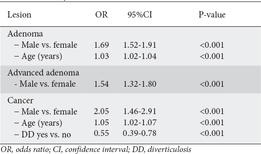On multivariate analysis, sex and age were found to be independent variables associated with different neoplastic lesions in the colon, whereas diverticulosis, as well as all the other variables considered, were not (Table 2). Adenomas, advanced adenomas and cancers were less prevalent in female than in male patients, and their prevalence increased with age, whereas patients with diverticulosis showed a lower risk of cancer.