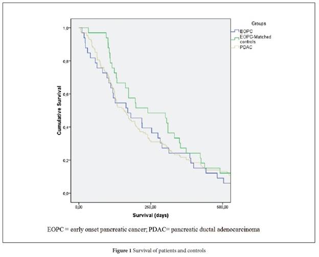 Family history in the EOPC group revealed only one patient (3%) with a relative with pancreatic cancer. There was no evidence for familial pancreatitis or other hereditary diseases. In the EOPC cohort, 13 patients (40%) were previously diagnosed with bilary-pancreatic diseases. There was no difference in the frequency of chronic pancreatitis between groups, (p=1.0).